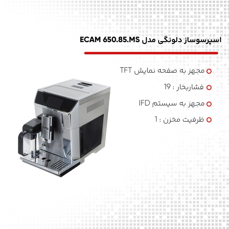مشاهده محصولات مرتبطاسپرسوساز مدل ECAM 650.85.MS محصولی از برند « دلونگی » (Delonghi) است که با استفاده از آن میتوان انواع نوشیدنیهای گرم ازجمله اسپرسو، کافه لاته، موکا، کاپوچینو، شیر داغ و ... را با آن تهیه کرد. این محصول با طراحی زیبا و کیفیت ساخت بالا روانه بازار شده است. وزن این محصول در حدود 12.5 کیلوگرم است که در مقایسه با محصولات مشابه، سنگین محسوب میشود. جلوی دستگاه یک صفحهنمایش با سایز 4.3 اینچ قرار گرفته است. حداکثر فشار این دستگاه برابر با 19 بار است. قرار گرفتن سینی چکهگیردر قسمت پایین دستگاه از کثیفشدن سطح میز جلوگیری کرده و نظافت دستگاه را آسان میکند. همچنین قابلیت جداسازی این سینی و مخزن آب، نظافت آن بسیار راحت شده است. بهرهگیری از فناوری بلوتوث، سیستم IFD، قابلیت تمیز کردن خودکار و قابلیت خاموش شدن خودکار ازجمله ویژگیهای دیگر این محصول است. گفتنی است که این دستگاه توانسته است تا گواهی CE را نیز دریافت نماید.