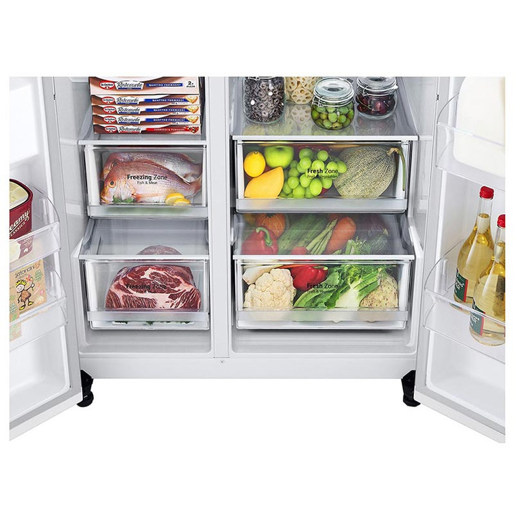 مطمئناً با همان نگاه اول متوجه شدید که آبریز و یخسازی ویژه ای بر روی درب یخچال فریزر تعبیه شده است. هر چند ممکن است بیشتر یخچال ها دارای این گزینه باشند اما تفاوت در طراحی و سیستم بکار رفته موجب تمایزشان از هم می شود. آبریز ساده و در عین حال کاربردی باعث می شود در هر زمان بدون نیاز به باز کردن درب و بیرون آوردن بطری بتوانید آب مورد نیازتان را بنوشید یا حتی بهتر از آن میتوانید با فشار دادن دکمه یخساز چند حبه یخ کوچک، شفاف و منجمد را در نوشیدنی تان بیندازید. البته این مورد پیشنهاد نمی شود چون مصرف آب یخ برای بدن کمی مضر است کشوهای Fresh Zone در یخچال ال جی