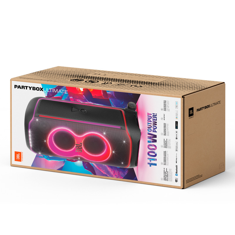 اسپیکر پرتابل و بلوتوثی Ultimate نسل جدید اسپیکرهای سری PartyBox از برند محبوب جی بی ال است. این اسپیکر قابل حمل با درایورهای بهبود یافته و سخت افزار بروز شده، تجربهی صوتی متفاوتی را به شما ارائه میدهد. همچنین طراحی ظاهری زیبا و چشمگیر آن همراه با بدنهی ضدآب و مقاوم ، شما را با سطح جدیدی از سیستمهای صوتی پرتابل آشنا میکند. دلیل نامگذاری این اسپیکر ظرفیت بالای صدای تولیدی و آخرین و به روزترین تکنولوژیهای نوری و سیستماتیک این محصول است همچنین برای اتصال این اسپیکر به دستگاههای پخش مانند گوشی موبایل یا پلیرها ، از تکنولوژی بلوتوث استفاده شده است تا بتوانید به راحتی به این اسپیکر متصل شده و به صورت بی سیم موسیقی مورد علاقه خود را بشنوید. جی بی ال در سری جدید اسپیکر Ultimate از بلوتوث نسخه 5.3 که جدید ترین نسخه در حال حاضر است استفاده کرده است و این اسپیکر حرفهای دارای صدای قدرتمند و شفافی است که توسط درایور های جدید و بهبود یافته تولید و پخش میشود. 2 عدد ساب ووفر 242میلی متری(9 اینچی) به همراه 2 عدد بلندگوی مید رنج 120میلی متری(4.5 اینچی) و 2 عدد بلندگوی تیوتر 74 میلی متری(2.75اینچی)در کنار هم تجربهی صوتی جدید و بی نظیری را برای شما فراهم میکنند. در مجموع این محصول قادر است تا صدایی به قدرت 1100 وات RMS را تولید کرده و به گوش شما برساند. بازه فرکانسی قابل پخش در این سیستم صوتی مابین 30 هرتز تا 20000 هرتز است که برای اسپیکری با این ابعاد فوق العاده است. تنظیمات افکتهای صوتی و نوری نیز از جدید ترین نوع بوده و رقص نور و نور پردازی با جزعیات دقیق آهنگ پخش شده هماهنگ میگردد. ورودیهای میکروفن و گیتار هم دارای تنظیمات دقیقی است تا هر آنچه از صوت و تصویر برای برپایی میهمانیهای خود نیاز دارید در کنار هم جمع باشد.با وجود وزن زیاد این محصول،چرخ های تقویت شده آن نسبت به مدلهای قبلی کارایی بهتری در جا به جایی آن در اختیار کاربر قرار می دهند.اتصال تمامی محصولات خانواده PartyBox به هم در این محصول دیده میشود و میتواند تمام کننده ی نیاز صوتی شما باشد.اسپیکر Ultimate برترین محصولی است که واژهی JBL Pro Sound را به تصویر میکشد.