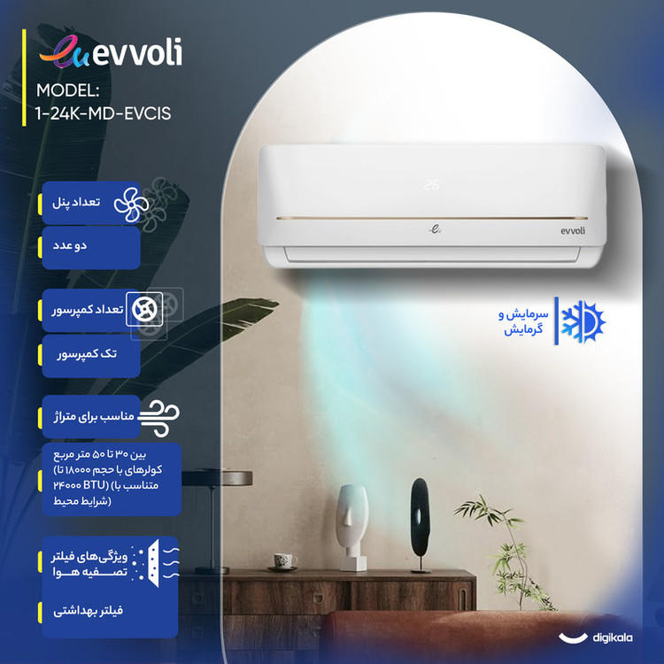 کولر گازی ایوولی 24000 گلدن خط طلایی جذابترین طراحی، چشمنوازترین نمایشگر و تا حدی قابلیت های خیلی خوبی دارد که در ادامه آنها را بررسی میکنیم. این دستگاه با دو عملکرد سرمایش و گرمایش، گاز R410a، رادیاتور مسی طلایی و… می باشد. کولر گازی ایوولی 24000 گلدن مدل MD1 (خط طلایی)، جدید ترین اسپلیت بالاردهی Evvoli، برخلاف روند حاکم بر بازار از تکنولوژیهای بسیار باکیفیت قدرت میگیرد؛ و تجربهای در سطح عالی برای کاربر به ارمغان میآورد. در ساخت این مدل از گاز R410a استفاده شده که با محیط کاملا سازگار است و قدرت پرتاب باد بیشتری نسبت به گازهای دیگر دارد. نوع کمپرسور این دستگاه روتاری میباشد. کولر گازی ایوولی 24000 مدل گلدن MD1 (خط طلایی) دارای منبع تغذیه 220-240 ولت ، 50 هرتز و مقدار 1PH میباشد. نسبت راندمان انرژی این دستگاه 2.81 وات میباشد. ظرفیت سرمایش آن 24000 و گرمایش آن 26000 است. نوع کمپرسور کولر 24 هزار ایوولی PA280G2CS-4MTL است که زیر مجموعه شرکت GMCC میباشد. اگر در دماهای مختلف ( باز و بسته ) میزان دمای کولر گازی را بخواهیم محاسبه کنیم، در فضای داخلی 17~32 / 0~30 درجه سانتی گراد و در فضای خارجی 18~43 / -7~24 درجه سانتی گراد عملکرد دارد. موتور فن داخلی آن YKT-75-6-200L است که 144 وات ورودی دارد و سرعت آن 860 میباشد.