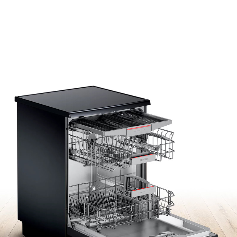 ماشین ظرفشویی بوش مشکی مدل SMS46NB01B سری 4 با داشتن 3 سبد ظرفیت 13 نفر را در اختیار شما قرار می هد که برای پرجمعیت و حتی کم جمعیت بسیار مناسب است چراکه این مدل دارای برای نیم شور یا همان Half Load می باشد این برنامه این امکان را به شما می دهد که لازم نیست منتظر پر شدن ظرفیت کامل ظرفشویی بمانید شما با استفاده از این برنامه می توانید فقط سبد پایین ماشین ظرفشویی خود را بشورید، این محصول که یکی از مدل های بسیار کم مصرف و بی صدا شرکت بوش می باشد چراکه شرکت بوش از موتور Eco Silence Drive به همراه بدنه عایق فوق کم صدا Super Silent در ساخت ماشین ظرفشویی بوش مشکی مدل SMS46NB01B استفاده کرده است و باعث شده این مدل رتبه انرژی ++A را کسب کند و در زمان شستشو در بالاترین سطح تنها 44 دسیبل صدا تولید می کند که در طول روز این میزان صدا به گوش شما نخواهد رسید.